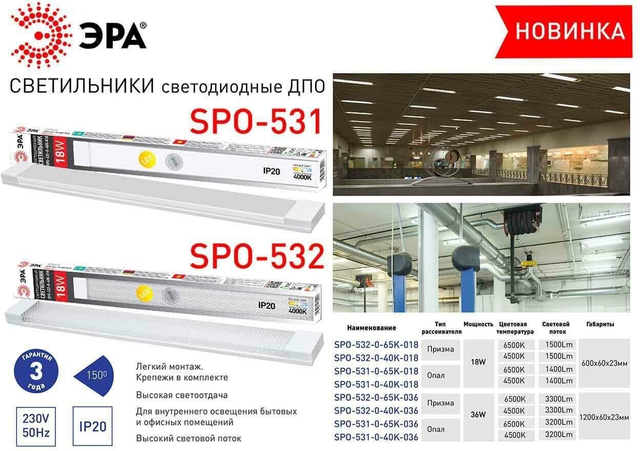 SPO-532-0-65K-036 ЭРА Линейный светильник IP20, 1,2 м, 36 Вт, 6500К, рассеиватель призма (20/480)