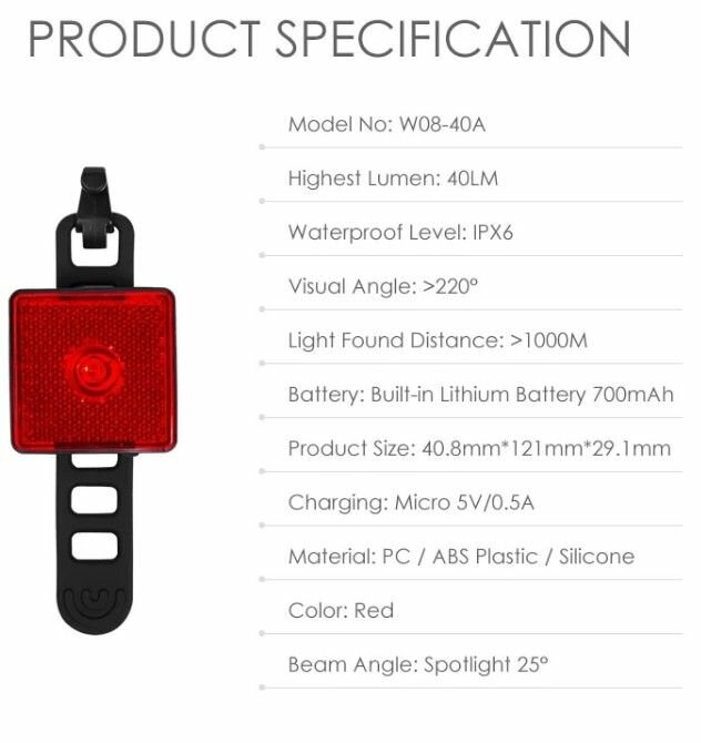Фонарь задний GACIRON W08-40A, 40lm, 1диод, Li-аккум, USB, угол 25 градусов. черный, W08-40A
