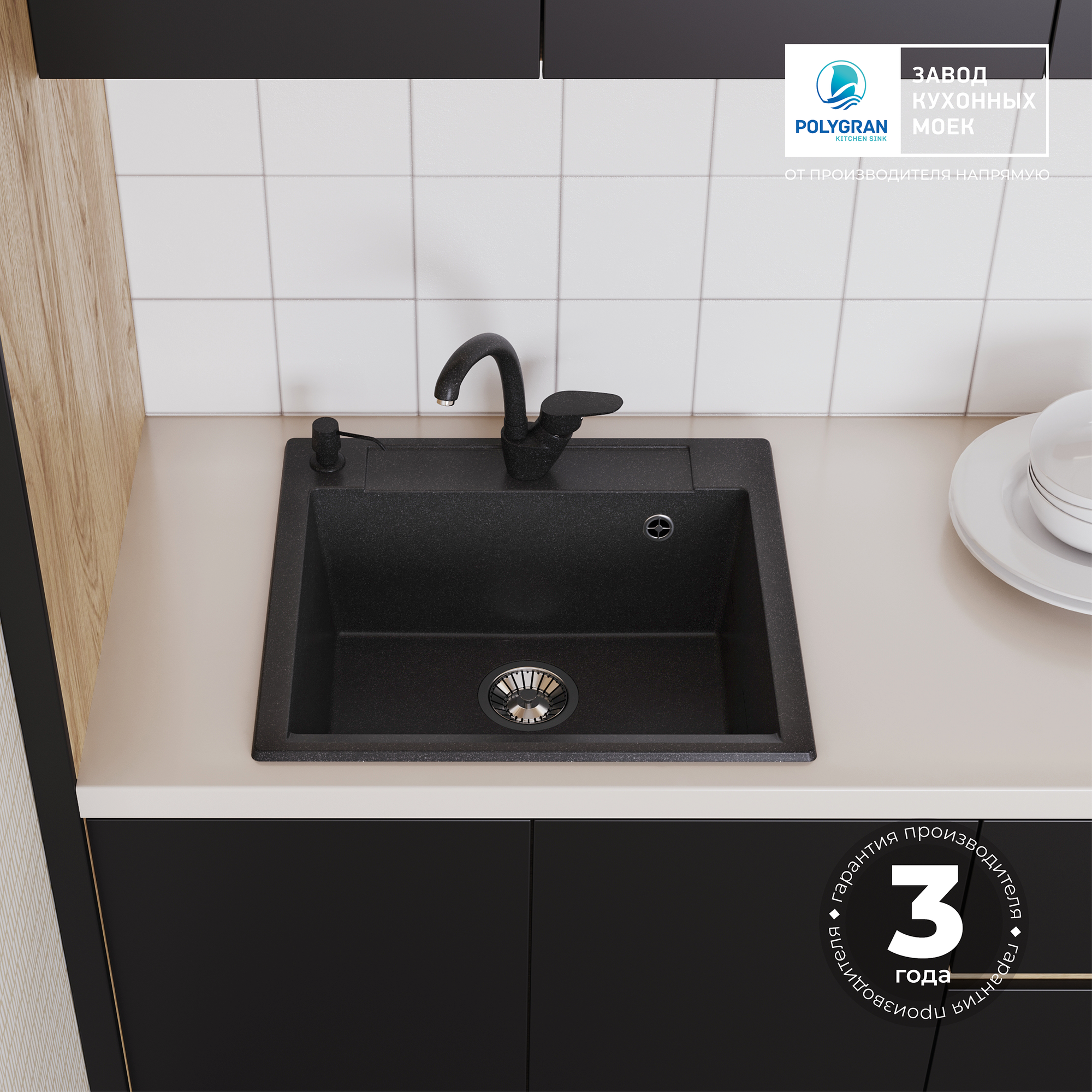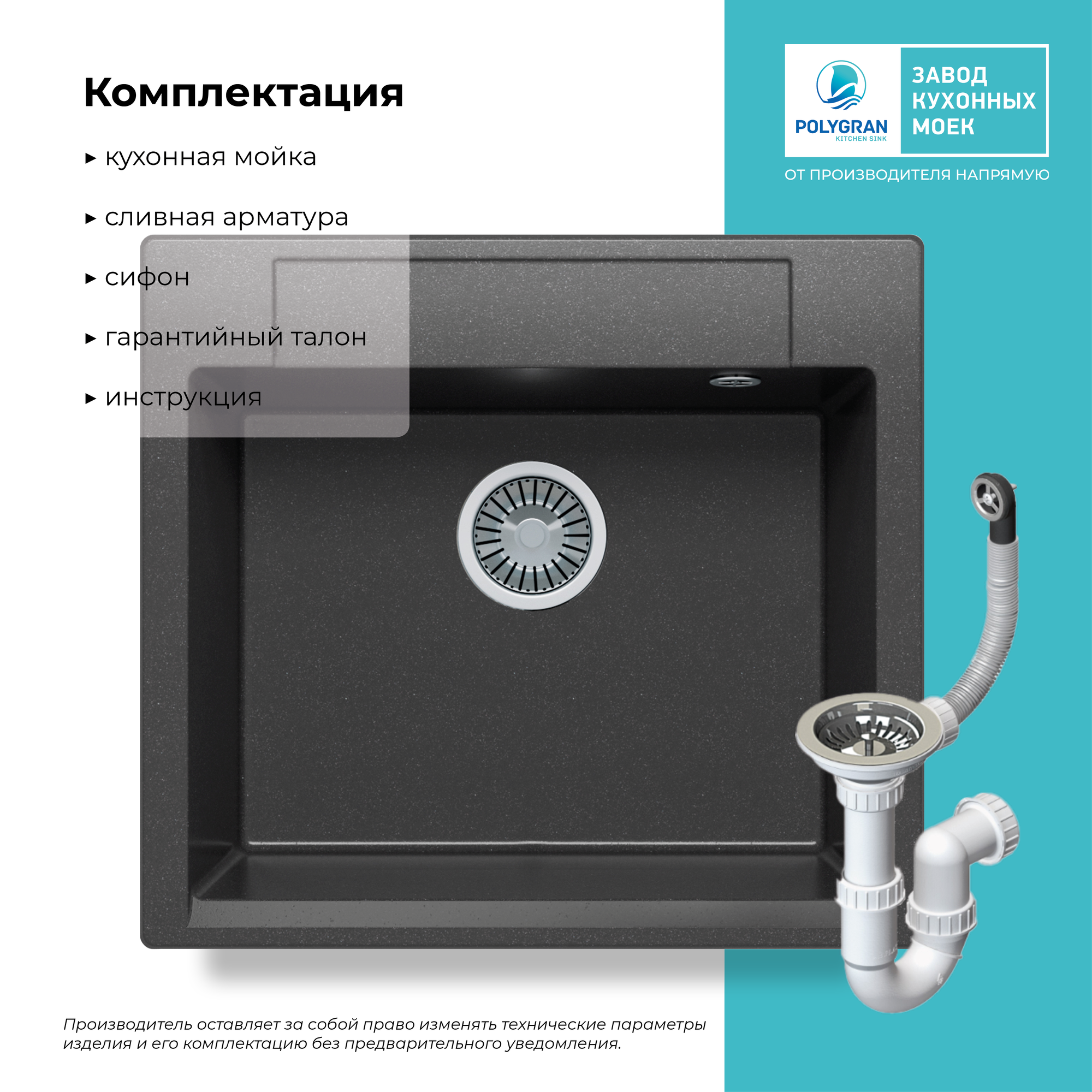 Мойка POLYGRAN, гранит-мрамор, ARGO-560, (510*560*200 мм), черный, сифон и сливная арматура