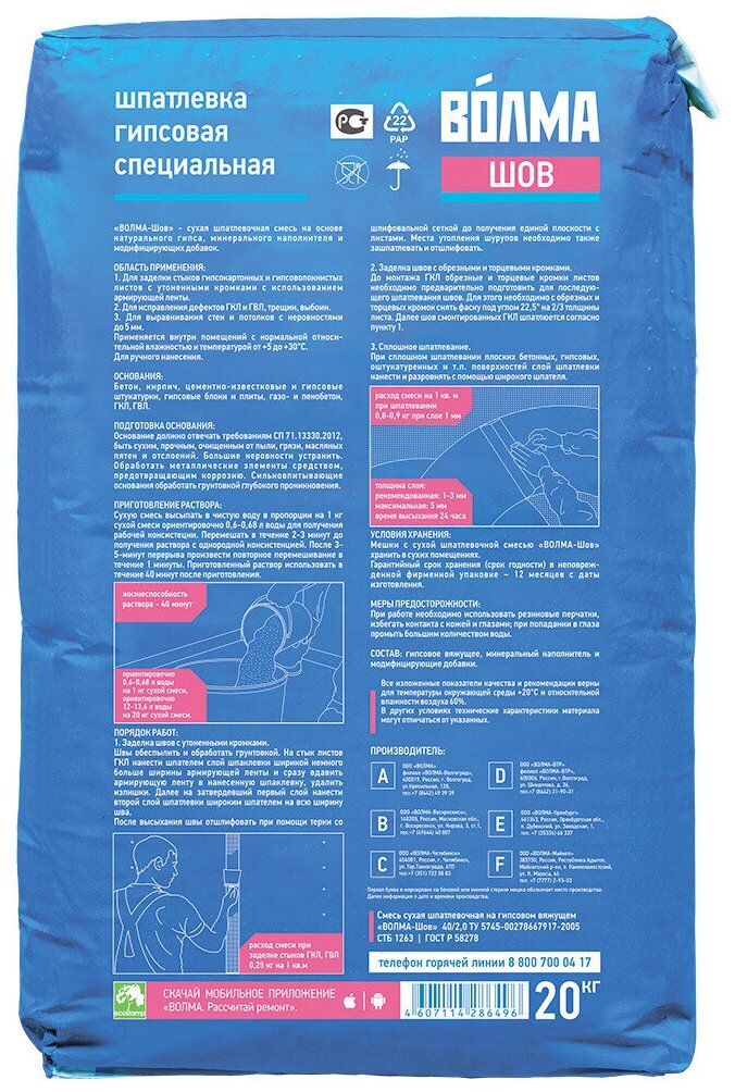 Волма Шов шпатлевка гипсовая для швов (20кг) / волма Шов шпаклевка гипсовая для заполнения швов ГКЛ, ГВЛ (20кг)
