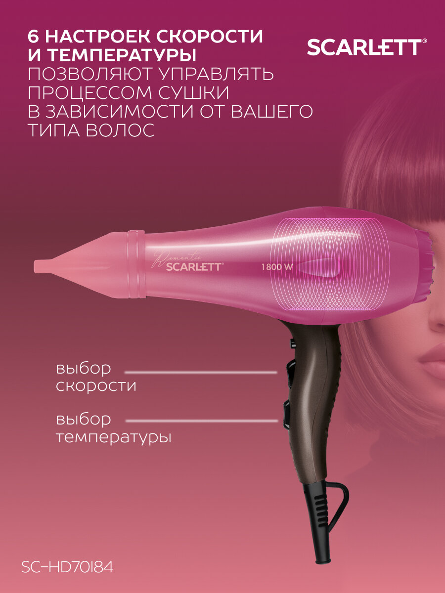 Фен Scarlett SC-HD70I84 , с мощностью 1800 Вт, 6 режимов