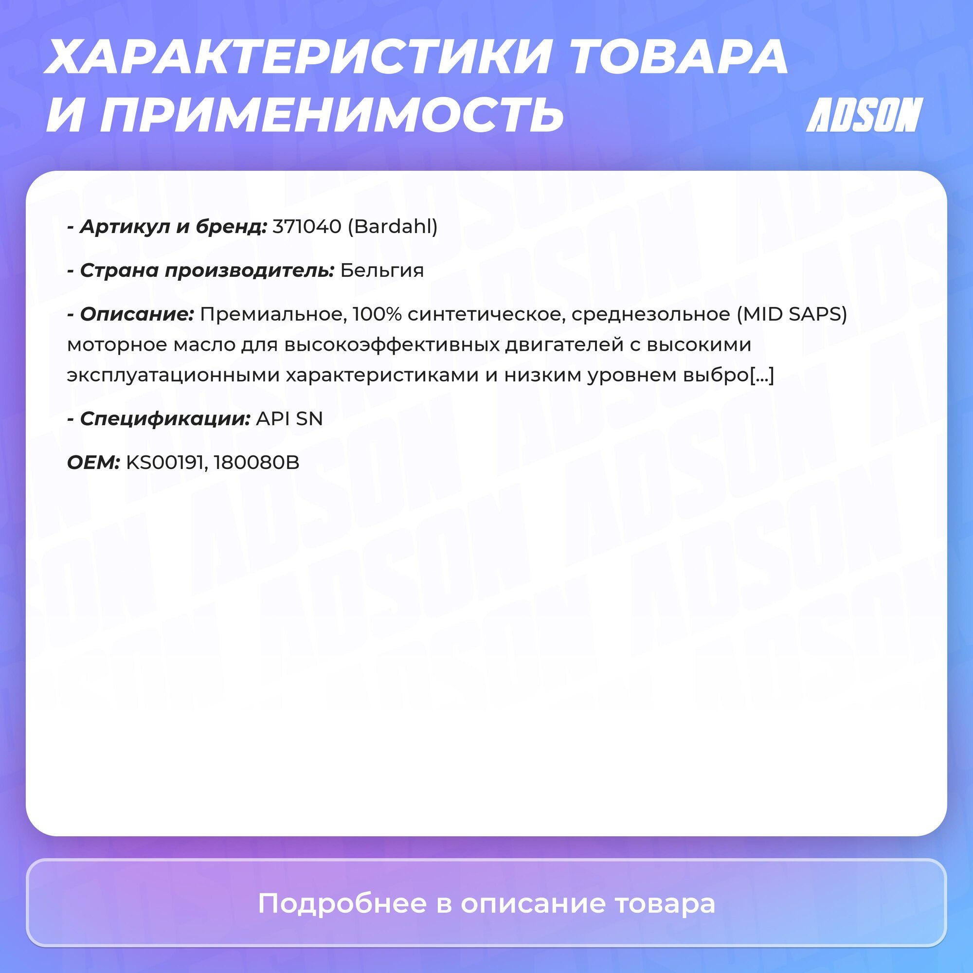 BARDAHL 371040 0W20 C5/SN/MB229,71 C60 TECHNOS XFS M2971 1 (специаизированное синт. моторное масо)