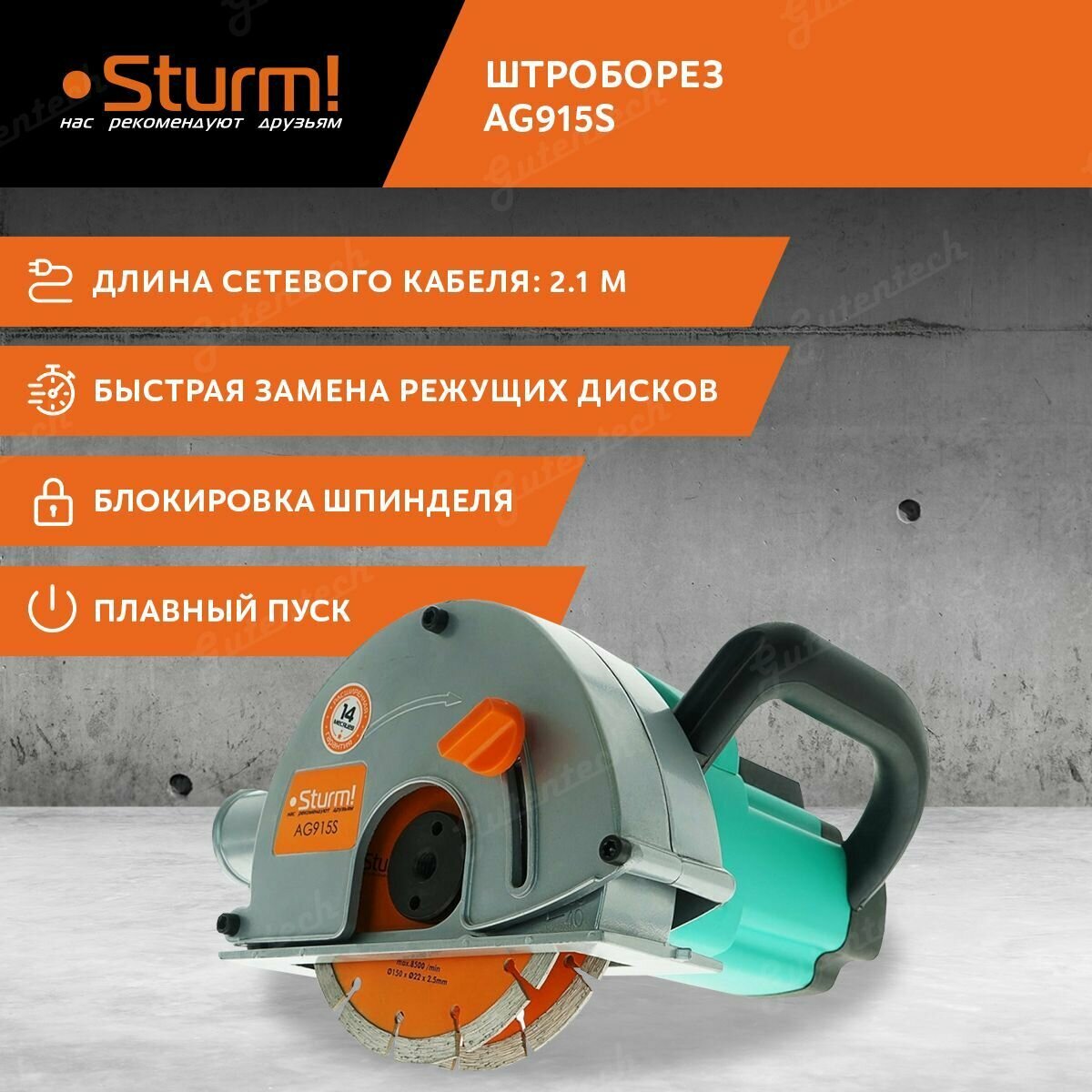 AG915S Штроборез 150мм, 1600Вт, 4000об/мин, плавный пуск, константная электроника, кейс, Sturm! Sturm!