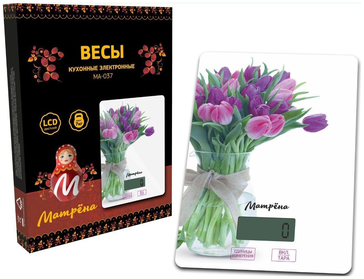 Кухонные весы Матрёна МА-037 тюльпаны белый/фиолетовый
