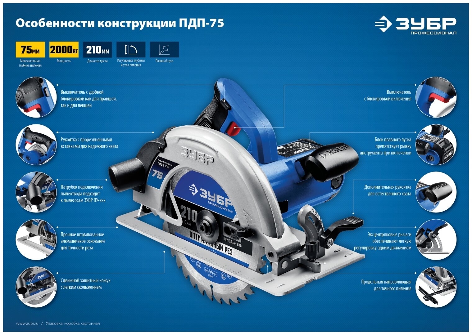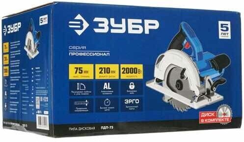 ЗУБР d 210 мм, 2000 Вт циркулярная пила (дисковая), Профессионал (ПДП-75)