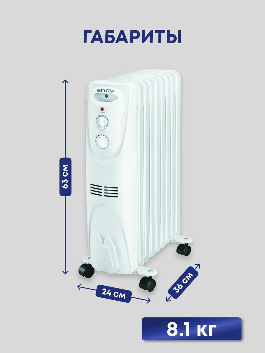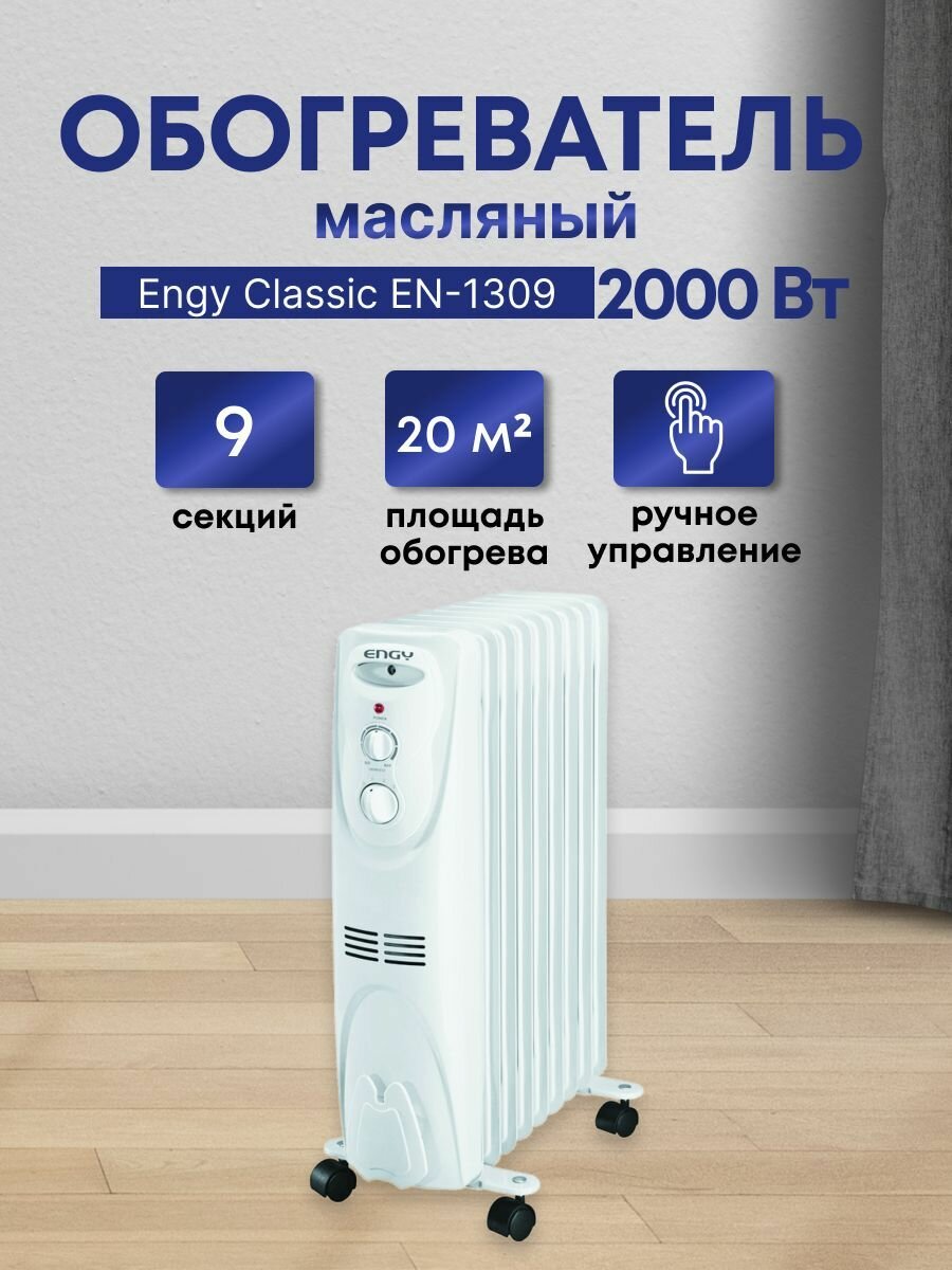 Масляный радиатор Engy EN-1309, 2 кВт, 20 м², колеса в комплекте, белый