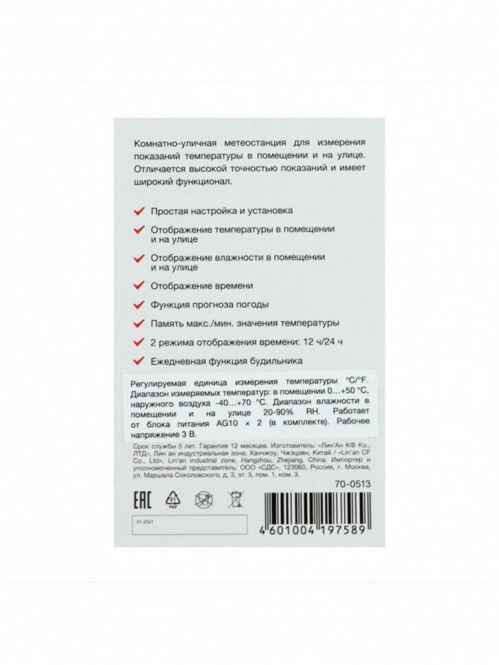 | Минусы: | Короткий шнур для выносного датчика, с окна до стола не дотягивается. Маленькие батарейки, хотя корпус по большей части пустой и можно было разместить отсек для батареек побольше, в результате батареек хватает на пару месяцев, потом очень тускло светит. |