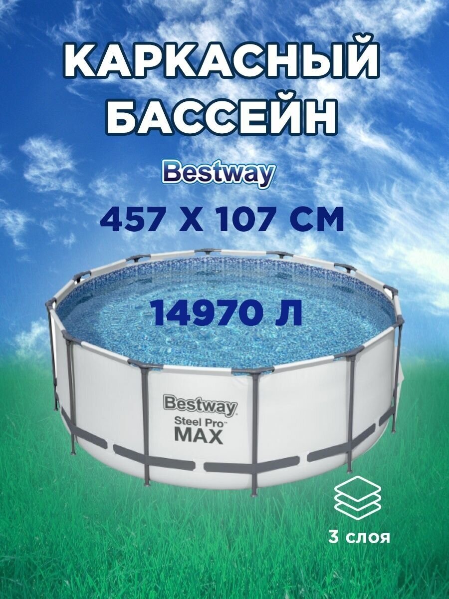 Бассейн каркасный круглый с фильтр-насосом Bestway 56488 Steel Pro Max 457х107 см 14970л / Бассейн бествей семейный для дачи с жестким бортом