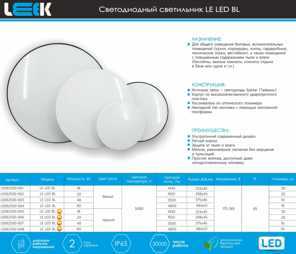 Светильник светодиодный потолочный LE LED BL IP65 40W 5000K LE062500-003 LEEK