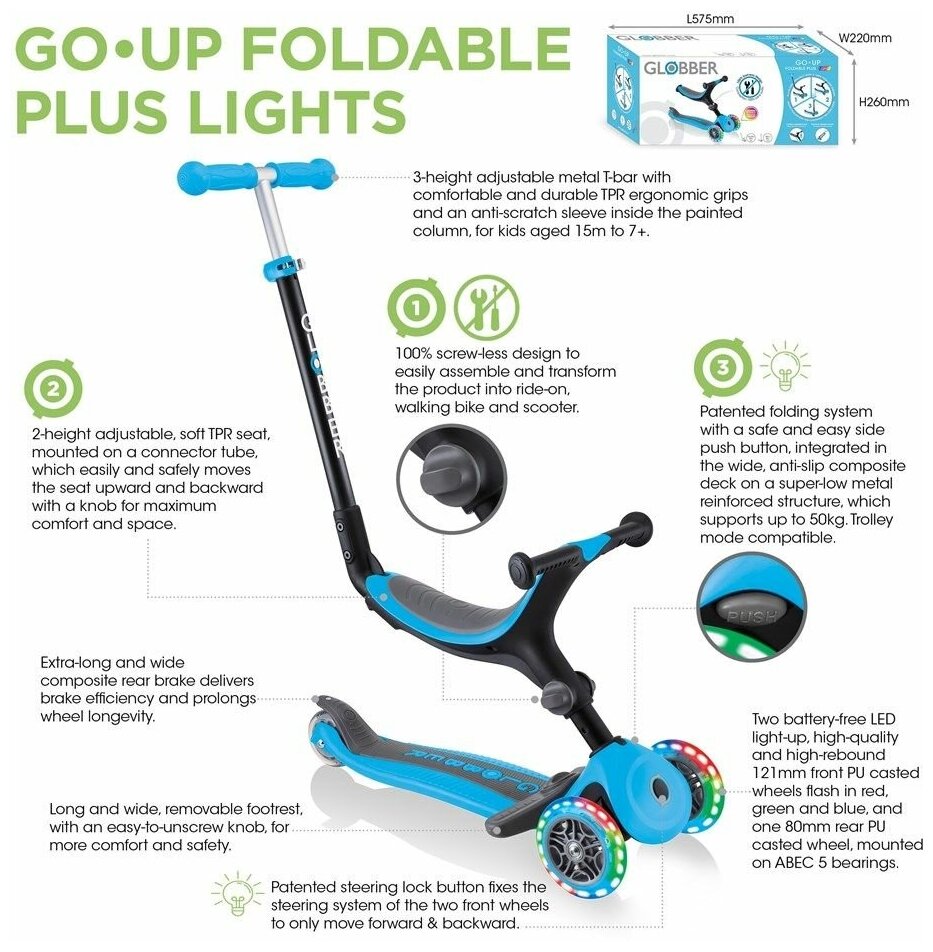 GLOBBER Трехколесный самокат-трансформер GO UP FOLDABLE PLUS LIGHTS Голубой