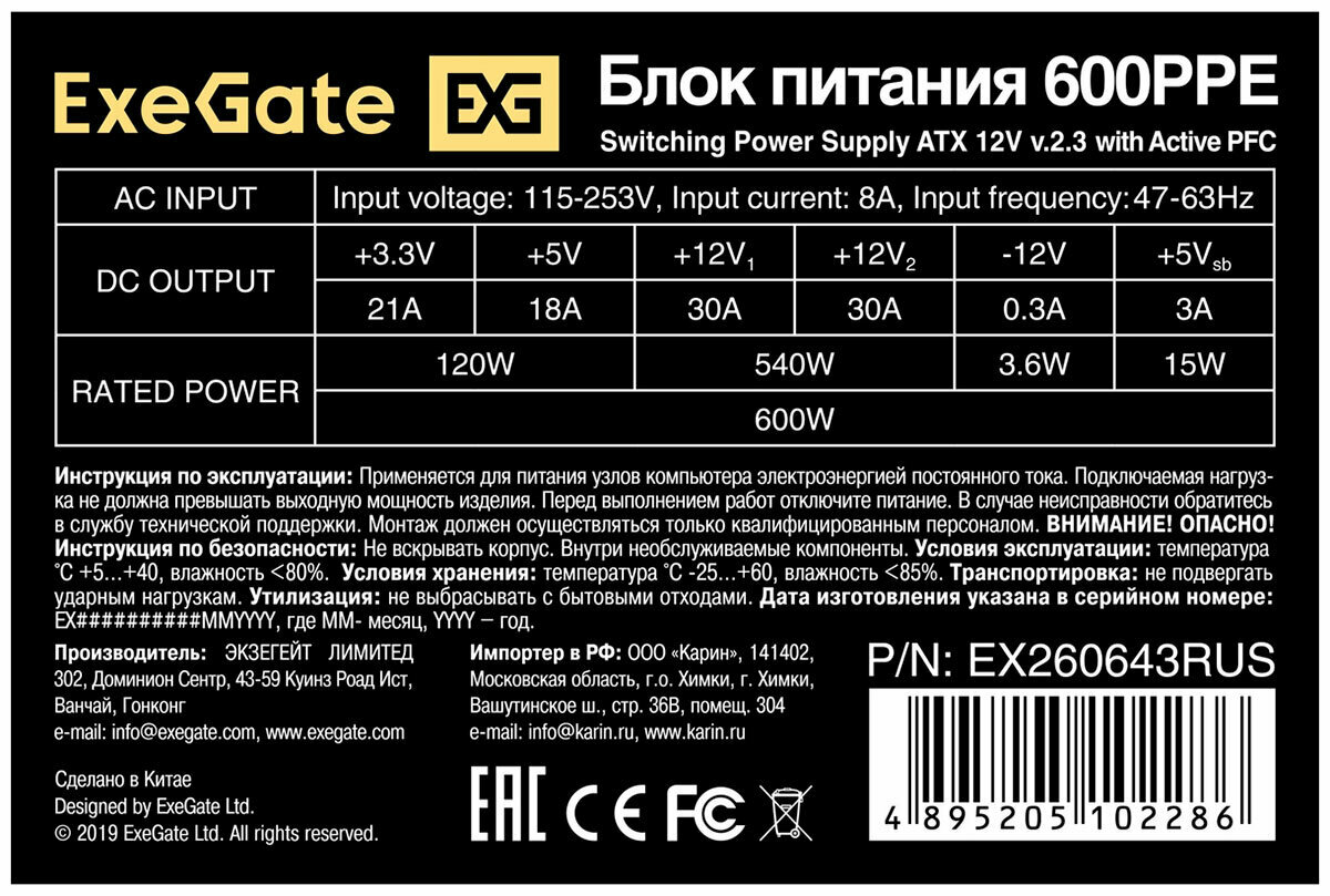 Exegate EX260643RUS-PC Блок питания 600W ExeGate 600PPE (ATX, APFC, PC, КПД 80% (80 PLUS), 12cm fan, 24pin, 2x(4+4)pin, PCIe, 5xSATA, 3xIDE, black, кабель 220V в комплекте)
