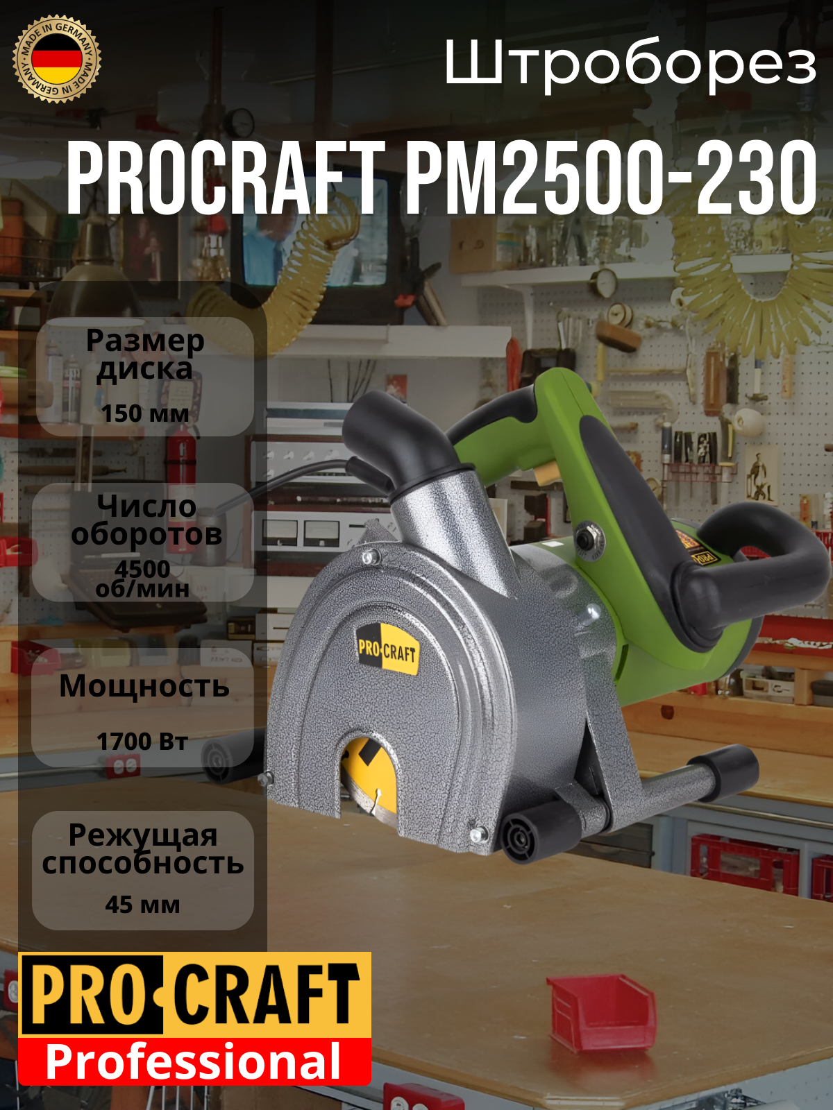 Ниже Вы можете прочитать отзывы на Штроборез PROCRAFT PM2500-230, 2500Вт, диск 150мм, 4500об/мин, 9-45мм, ознакомится с подробными характеристиками, посмотреть интересные обзоры и фотографии на Штроборез PROCRAFT PM2500-230, 2500Вт, диск 150мм, 4500об/мин, 9-45мм.