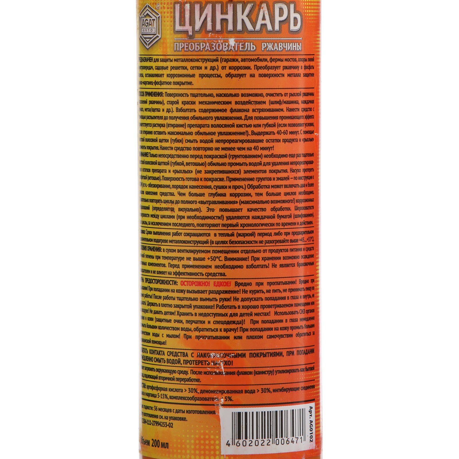 Преобразователь ржавчины цинкарь (флакон) 60мл AG0101 AGAT Avto AG0101