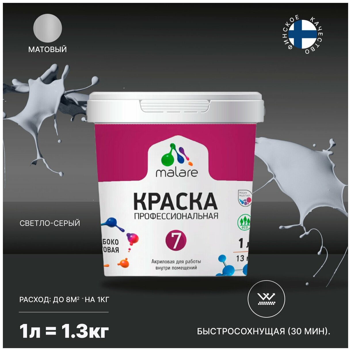 Краска Malare "Professional" Евро №7 для стен и обоев, потолка, деревянных и минеральных поверхностей, интерьерная акриловая, универсальная быстросохнущая без запаха матовая, светло-серый, (1л - 1.3кг).
