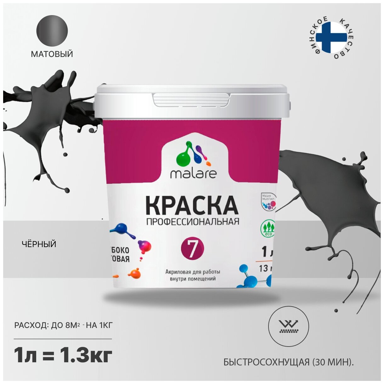 Краска Malare "Professional" Евро №7 для стен и обоев, потолка, деревянных и минеральных поверхностей, интерьерная акриловая, универсальная быстросохнущая без запаха матовая, черный, (1л - 1.3кг).