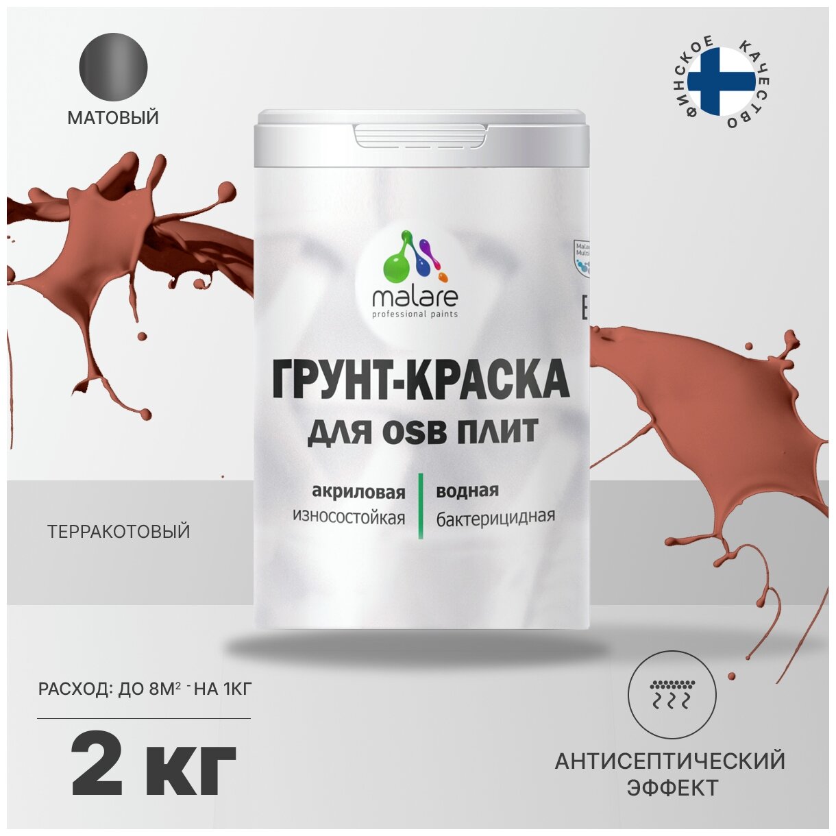 Краска Malare для OSB плит, деревянных и минеральных поверхностей, фасадная, интерьерная, универсальная, с антисептическим эффектом, быстросохнущая, без запаха, матовая, терракотовый, 2 кг.
