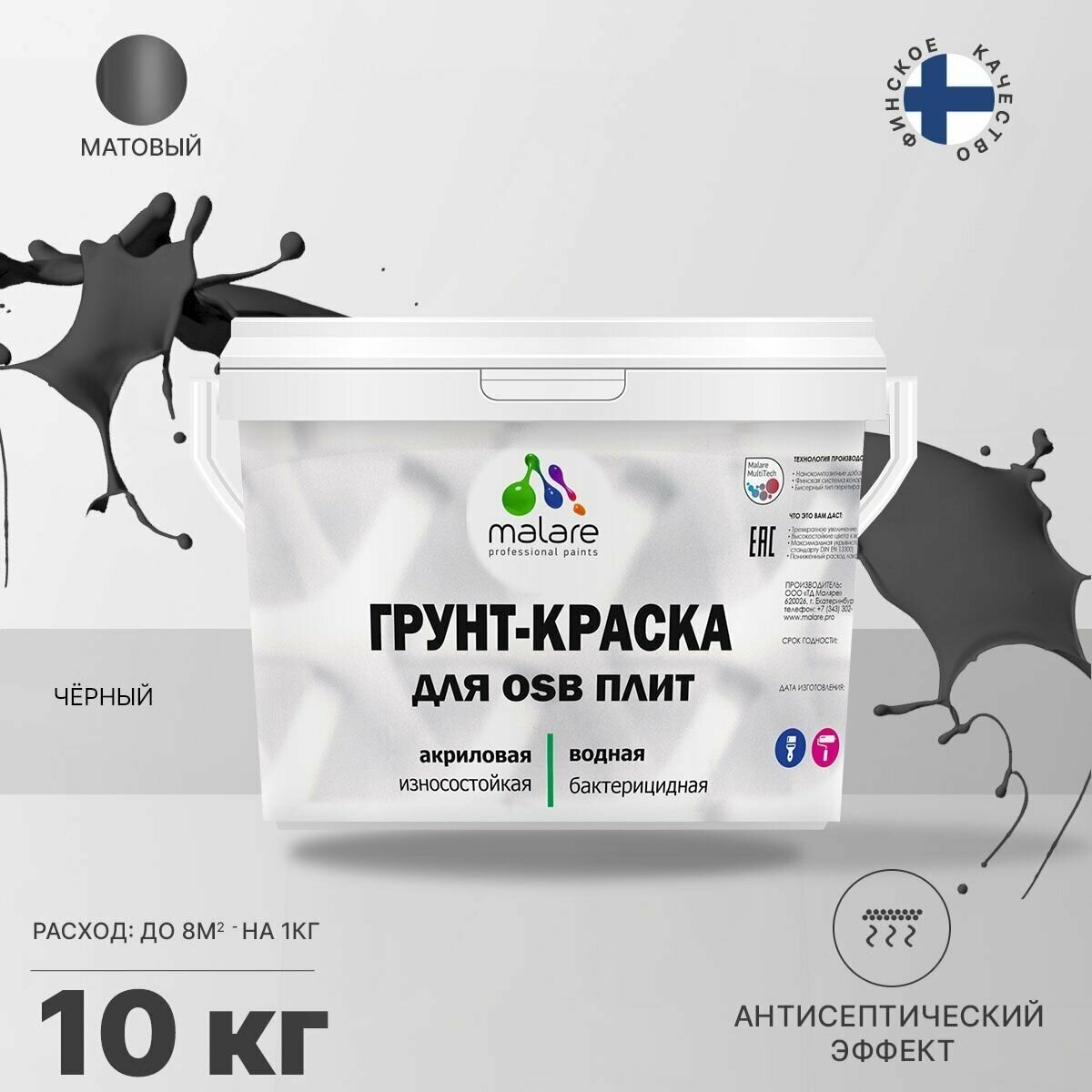 Краска Malare для OSB плит, деревянных и минеральных поверхностей, фасадная, интерьерная, универсальная, с антисептическим эффектом, быстросохнущая, без запаха, матовая, черный, 1 кг.