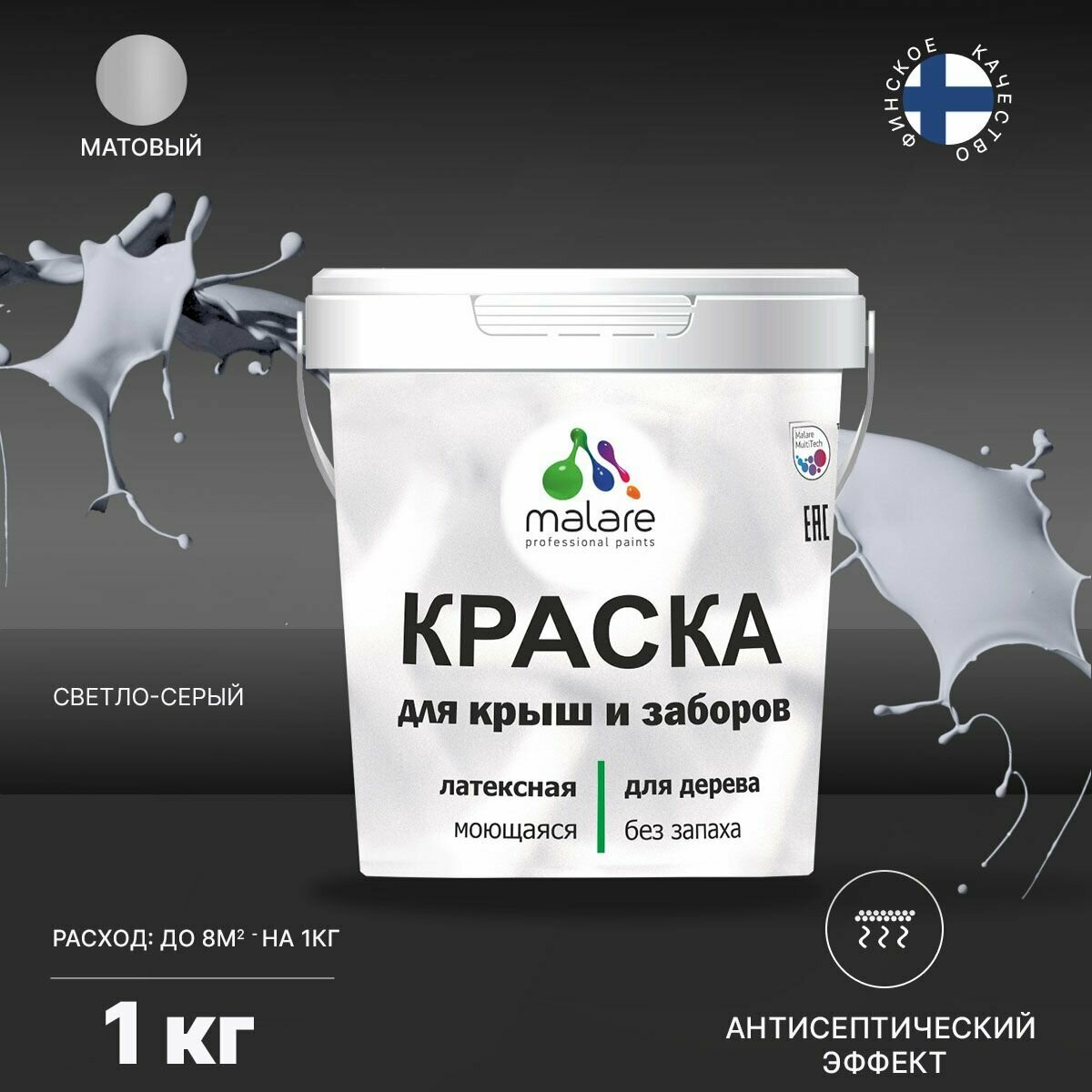 Краска Malare для деревянного забора, для крыши из шифера, для деревянных и минеральных поверхностей, с антисептическим эффектом, быстросохнущая, без запаха, матовая, светло-серый, 1 кг.