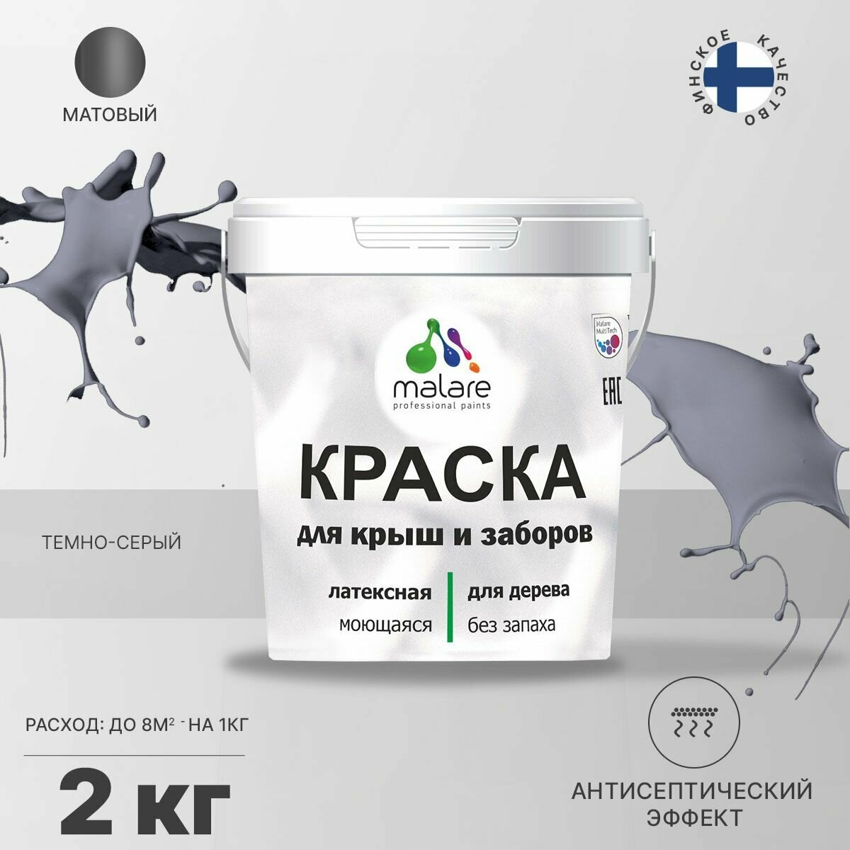 Краска Malare для деревянного забора, для крыши из шифера, для деревянных и минеральных поверхностей, с антисептическим эффектом, быстросохнущая, без запаха, матовая, темно-серый, 2 кг.