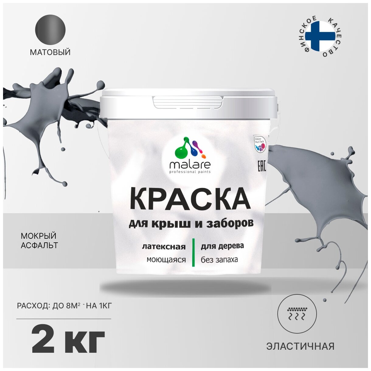 Купить Краска Malare для деревянного забора, шифера, с антисептическим эффектом, быстросохнущая, без запаха, матовая, мокрый асфальт, 2 кг