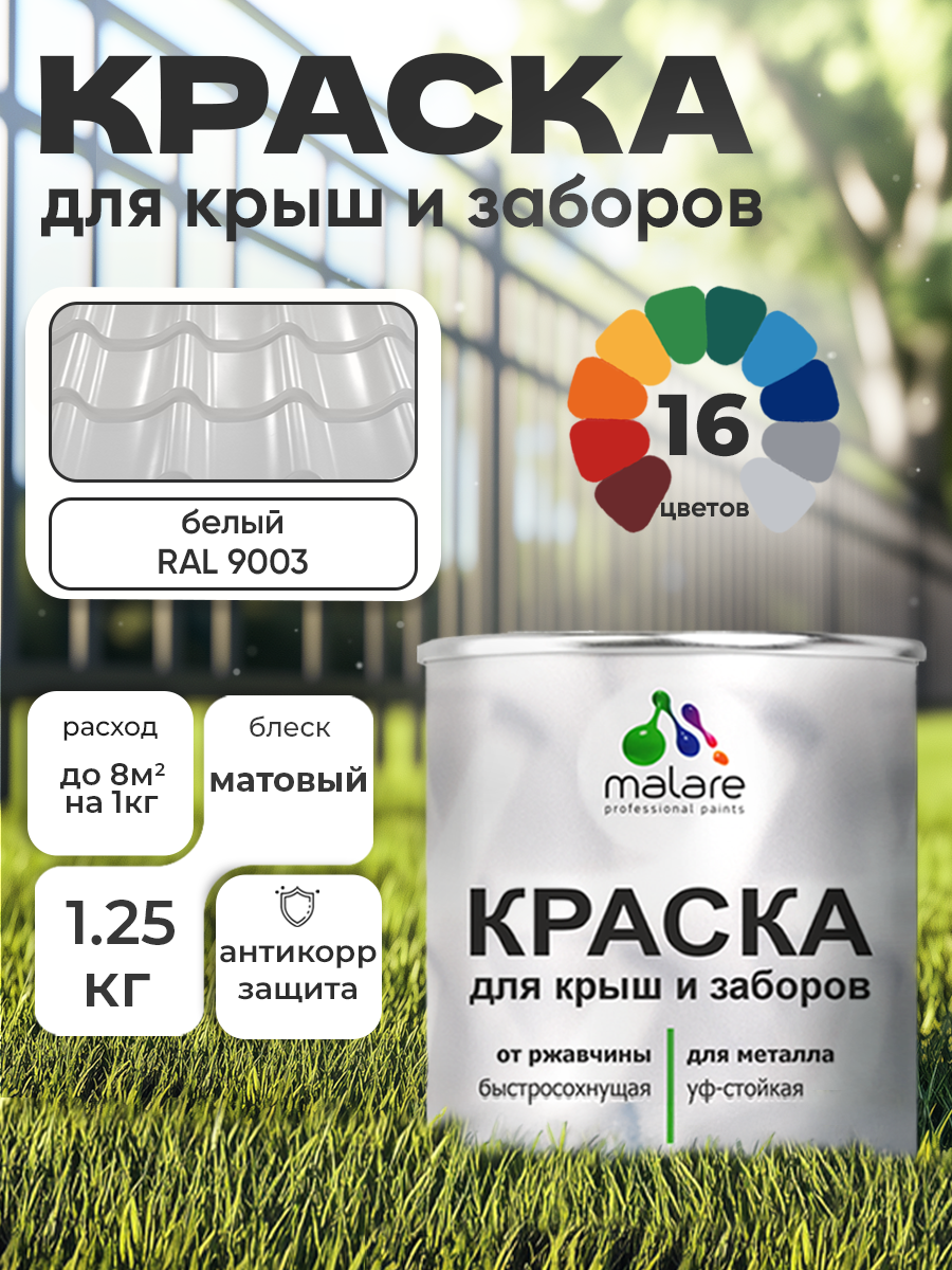 Купить Краска Malare для металлического забора, для крыши из металла, для металлочерепицы, антикоррозионная, матовый, белый, 1,25 кг.