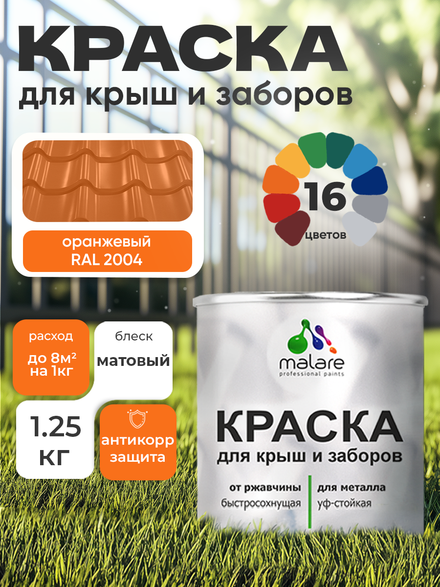 Купить Краска Malare для металлического забора, для крыши из металла, для металлочерепицы, антикоррозионная, матовый, оранжевый, 1,25 кг.