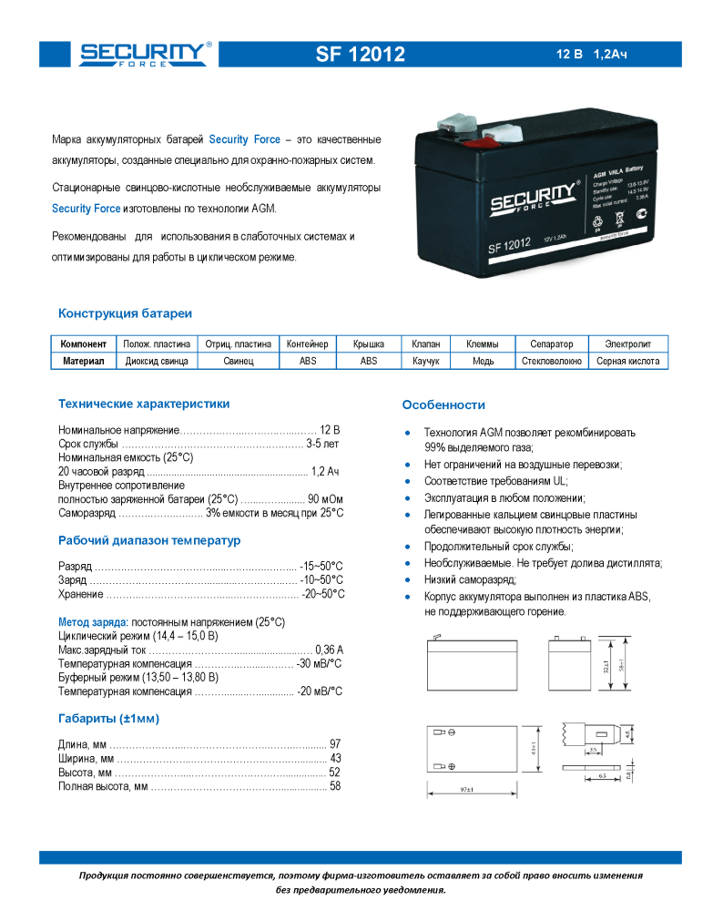 СохранитьАккумулятор ОПС 12В 1.2А.ч Security Force SF 12012 интересное: