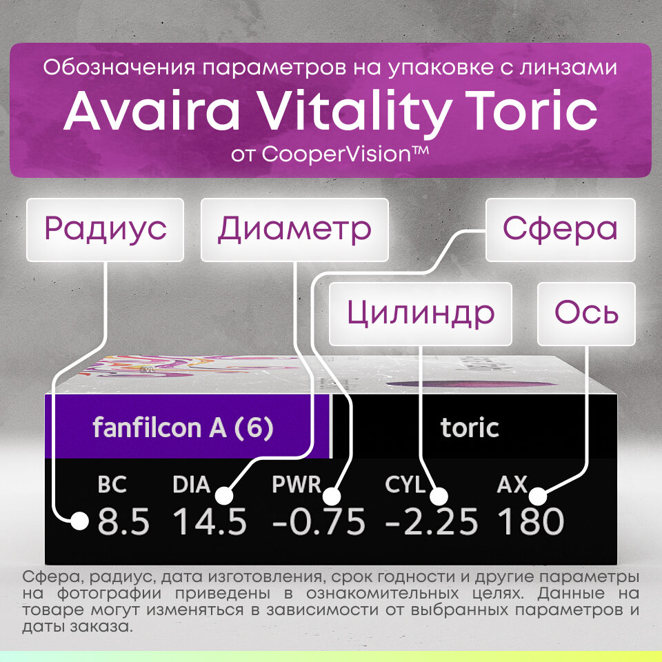 Avaira Vitality Toric 6 линз В упаковке 6 штук Ось 180 Оптическая сила цилиндра -2.25 Оптическая сила -6.5 Радиус кривизны 8.5