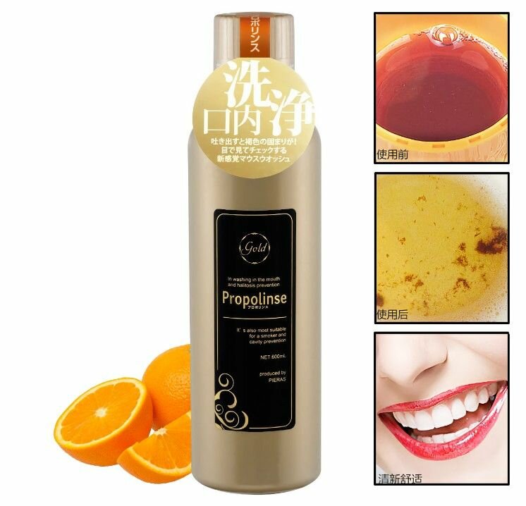 Ополаскиватель для полости рта PIERAS Propolinse Gold, с индикацией загрязнения, с прополисом и экстрактом цветков апельсина, 600мл.