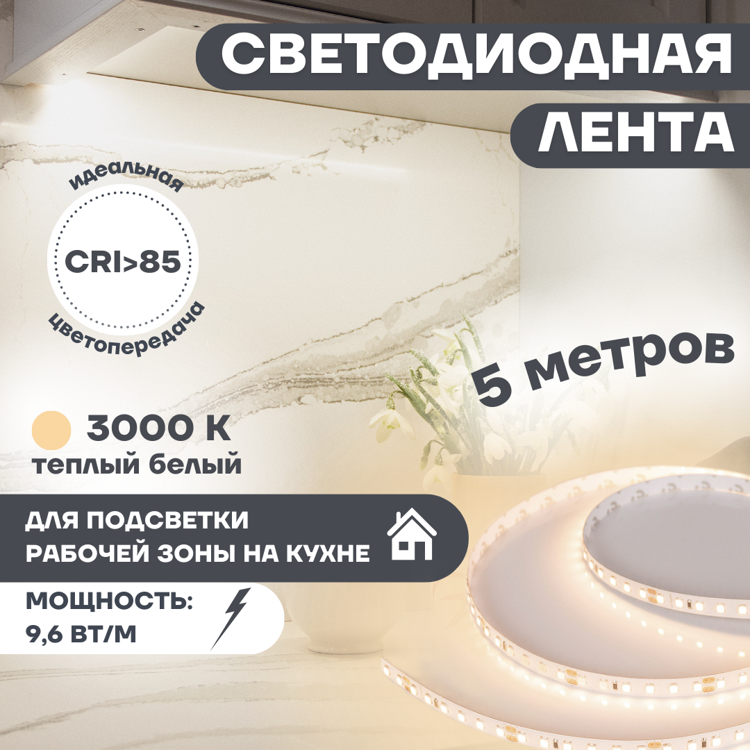 Светодиодная лента RT-A120-8mm 24V Warm3000 тёплый белый 9.6 W/m, IP20, 2835, 5 м Arlight для подсветки 024108(2)