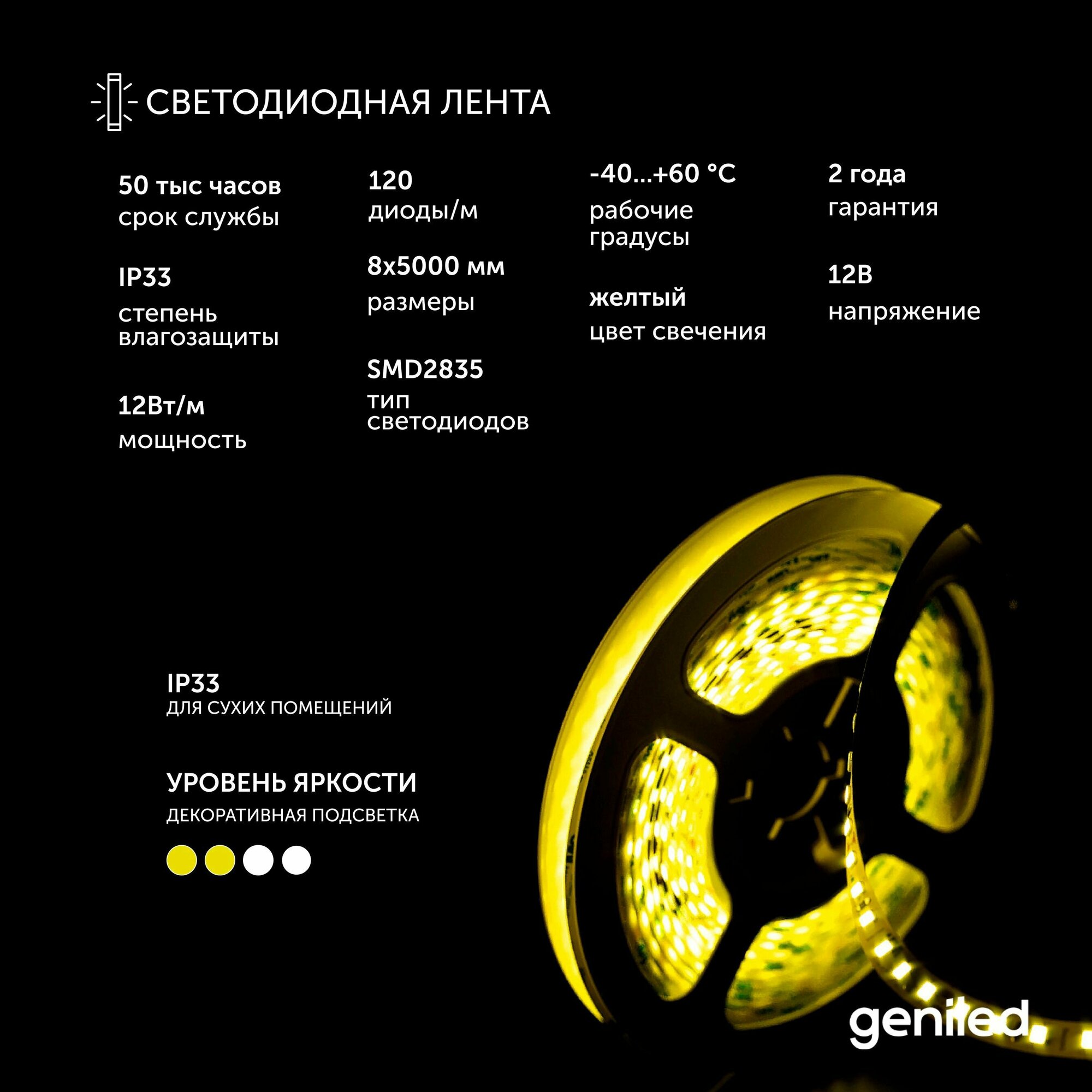 Светодиодная лента, подсветка Geniled - для комнаты, в гардероб, на кухню - Желтый свет / GL-120SMD2835 / 12В / Длинна - 5м / B - 8 мм / W - 12Вт / Yellow / IP33