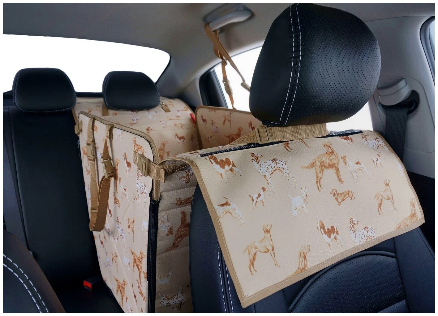 Автогамак для перевозки собак Happy Dog Premium (Хэппи Дог Премиум). На 1/3 заднего сиденья. Цвет: собаки на бежевом фоне.