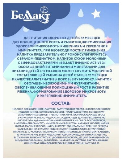 Напиток сухой молочный c бифидобактериями "Bellakt Immuno Аctive 3" обогащенный витаминами и минералами для питания детей с 12 месяцев, в картонной пачке, 400 гр.