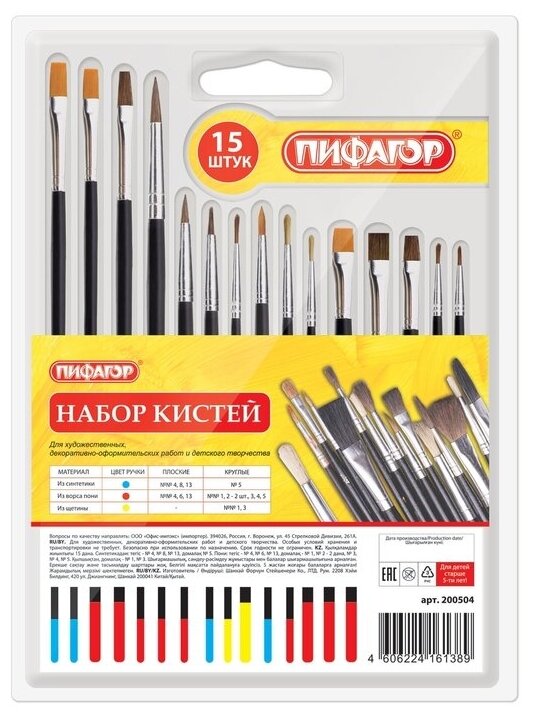 Кисти пифагор, набор 15 шт., (пони - 9 шт., синтетика - 4 шт., щетина - 2 шт.) интересное: