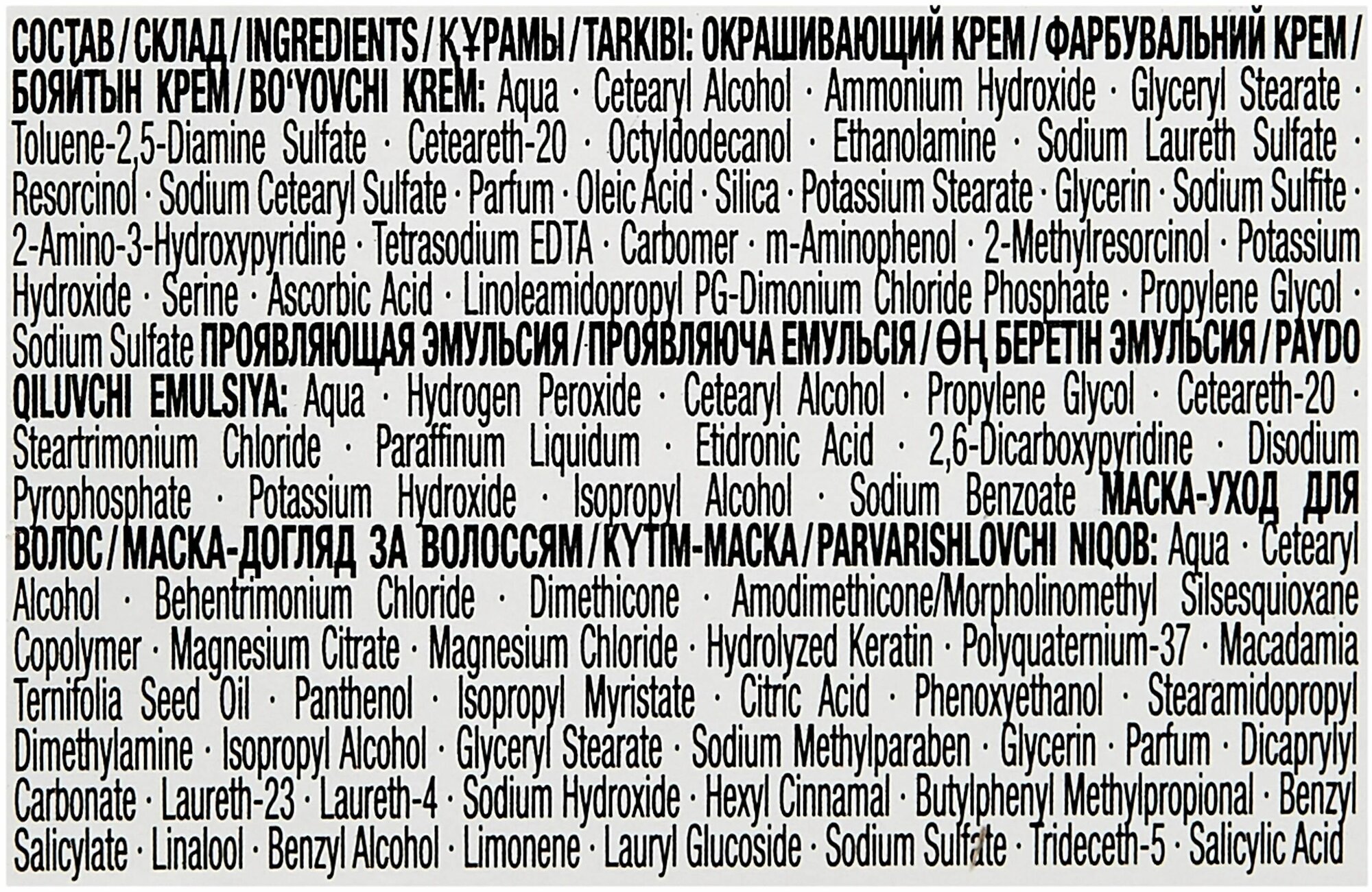 | Отзыв: | В состав краски входит тюбик с самой крем-краской, проявляющая эмульсия, перчатки, маска для ухода за волосами после окрашивания и инструкция.