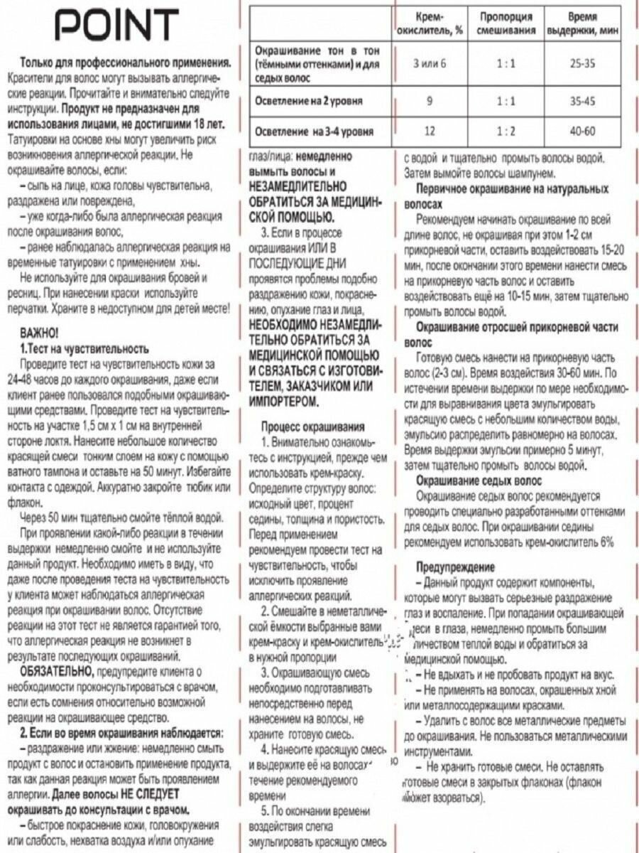POINT., промо Краска для волос для проф.прим., тон №1.0, Чёрный + 6% оксид, 100/100мл