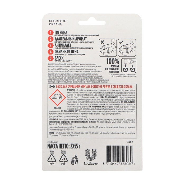 СохранитьDomestos блок для унитаза Power 5 Свежесть океана 0.055 кг 2 шт. интересное: