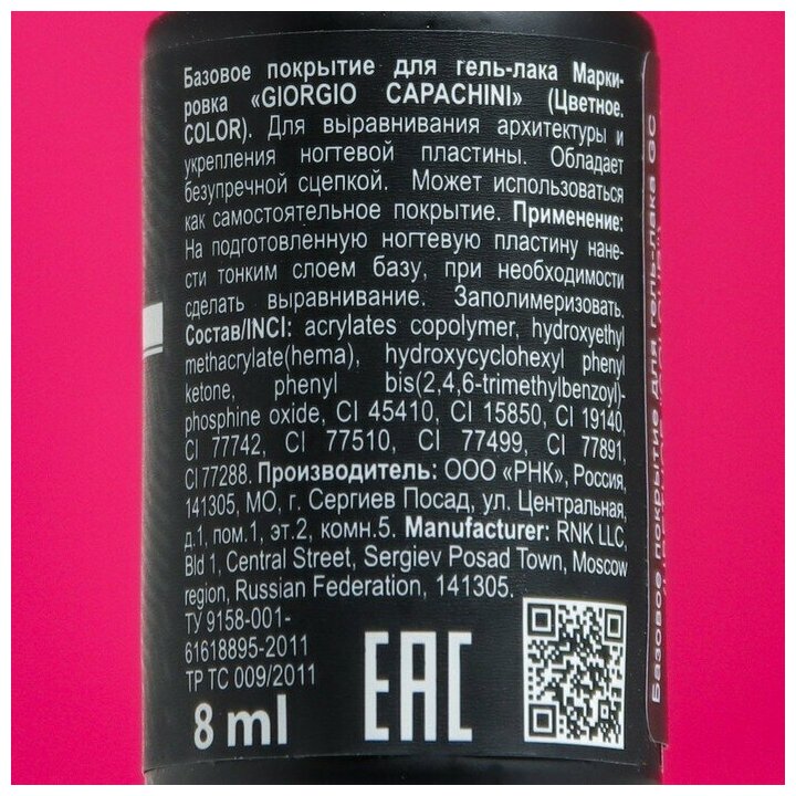 Giorgio Capachini, Базовое покрытие для гель-лака.Маркировка "GIORGIO CAPACHINI"8 мл (цветное №COLOUR") т.30, 20209061