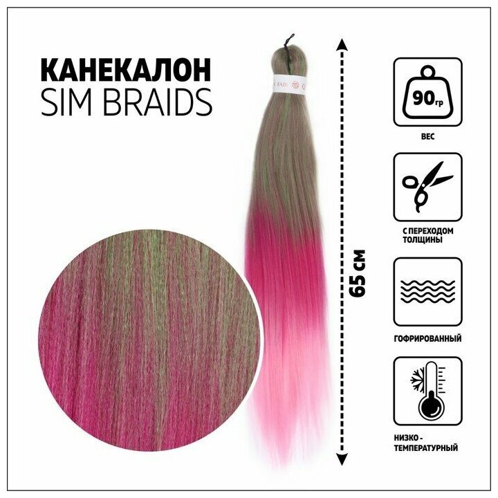 Sim-braids Канекалон трёхцветный, гофрированный, 65 см, 90 гр, цвет зелёный/розовый/светло-розовый(# .