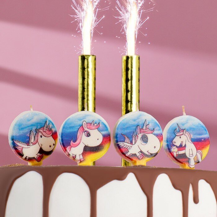 Купить Набор свечей в торт "Единорог", 4 шт + 2 фонтана
