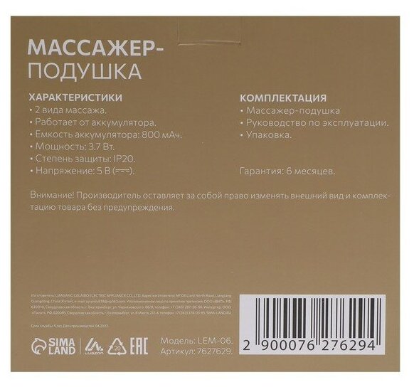 Массажная подушка LEM-06, 3.7 Вт, 2 вида массажа, ИК-подогрев, АКБ, серая интересное: