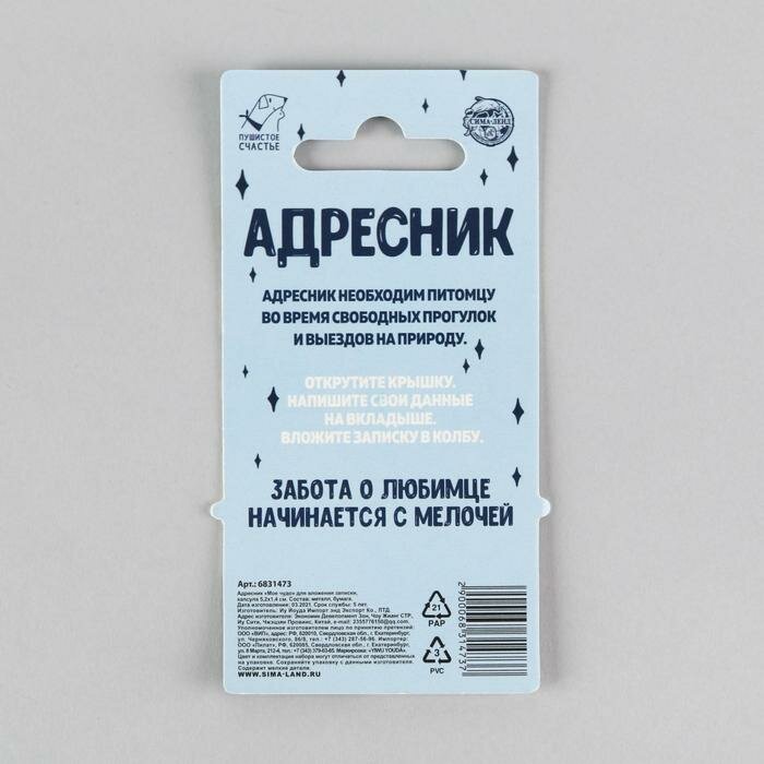 Пушистое счастье Адресник «Моё чудо» для вложения записки, капсула 5.2х1.4 см интересное: