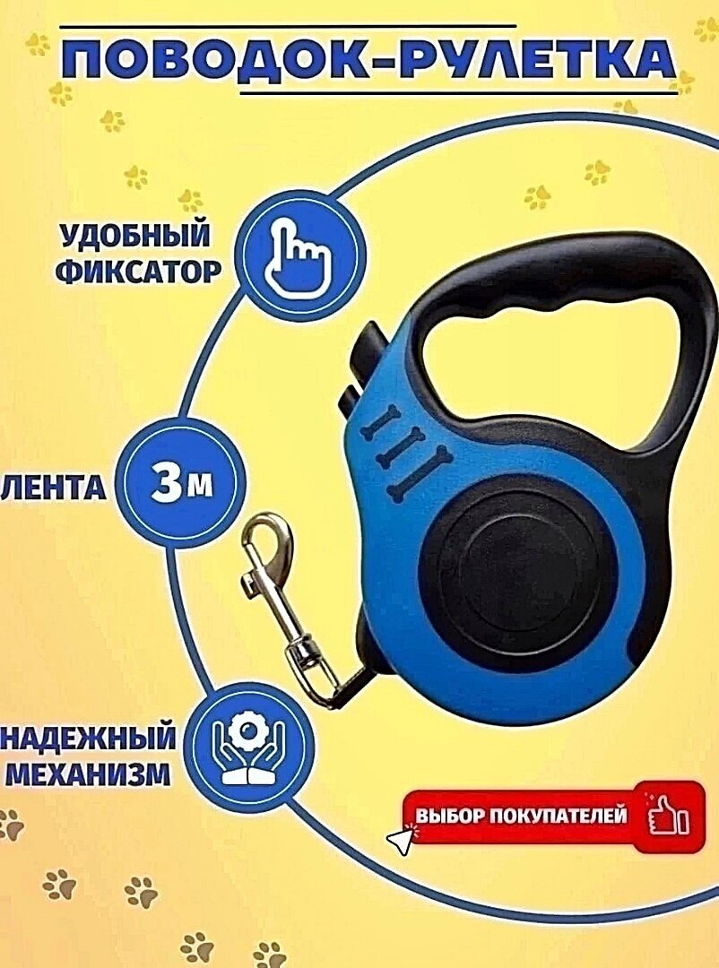 Рулетка для собак 3 метра 3м/Поводок для собак 3 метра 3 м с прорезиненной ручкой до 11,5 кг