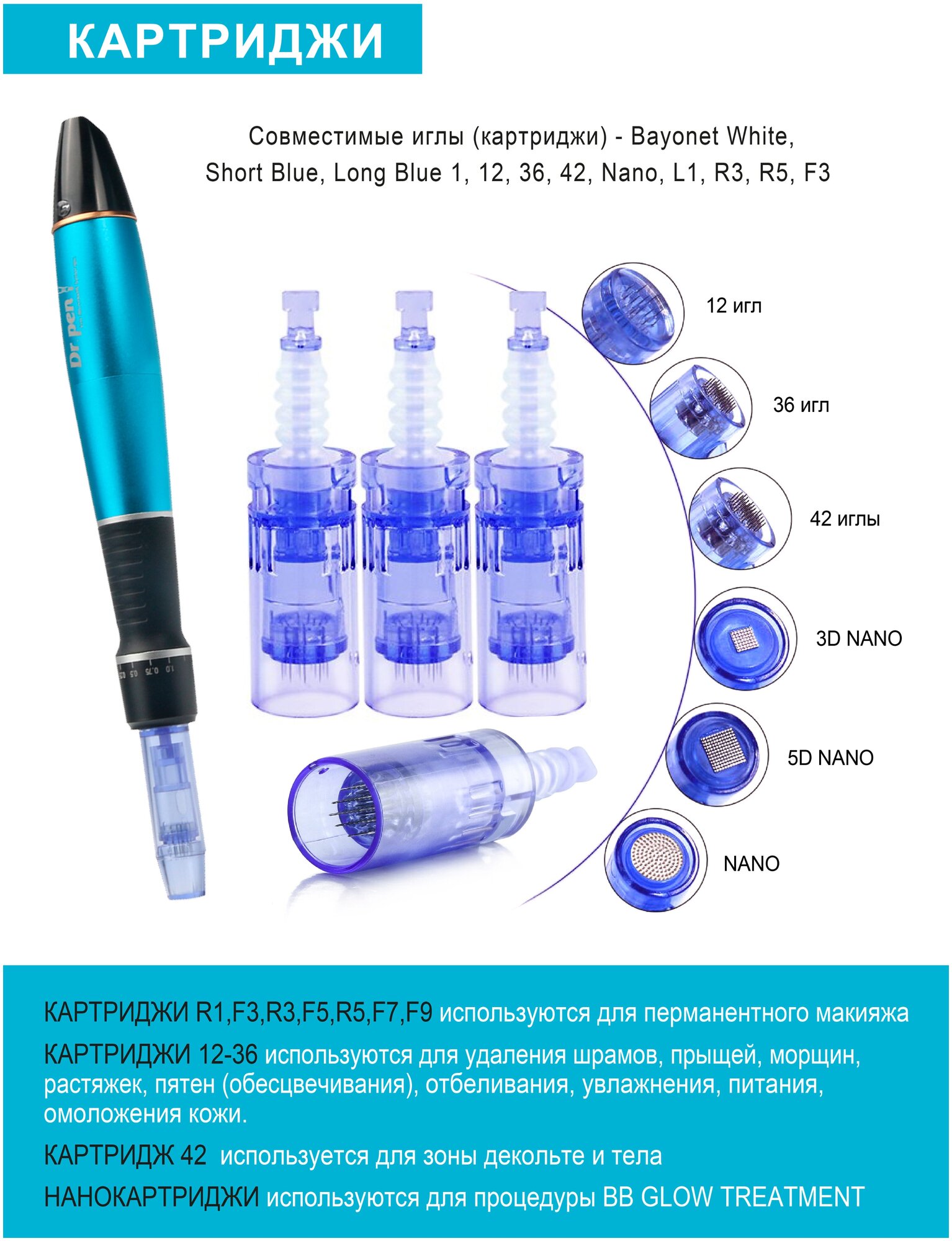 Dr. pen Картридж для мезопен на 36 игл насадка для аппарата dr pen дермапен синий длинный, 2 шт интересное: