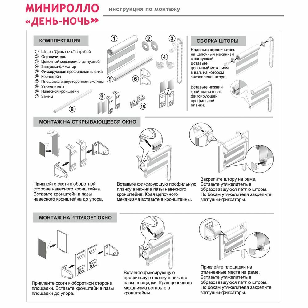 | Комплектация | штора "День-ночь" с трубой, ограничитель, цепочный механизм с заглушкой, заглушка-фиксатор, фиксирующая профильная планка, держатели, площадка с двусторонним скотчем, утяжелитель, навесной кронштейн, зажим, шурупы, фиксатор для цепочки |