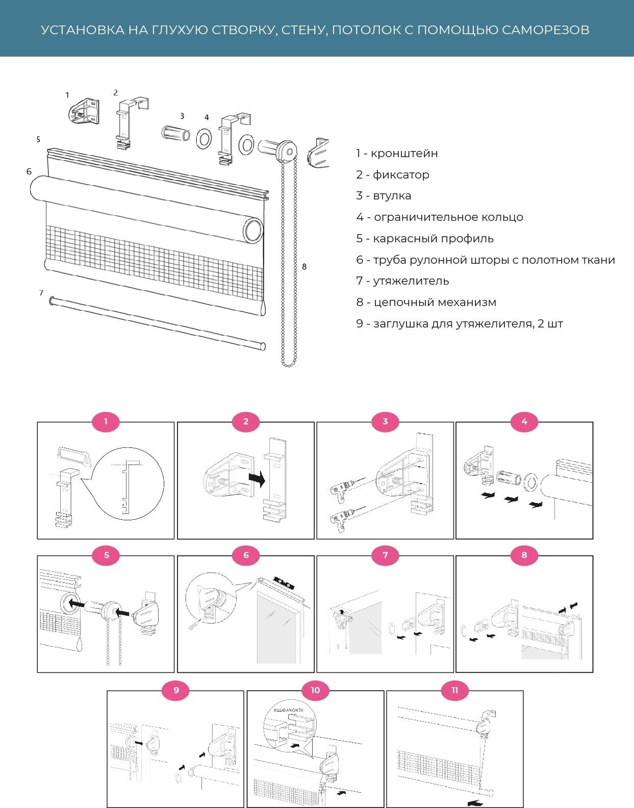 | Комплектация | рулонная штора мини в сборе, цепочный механизм, комплект кронштейнов для откидной створки без сверления, утяжелитель для ткани с фиксирующими заглушками, инструкция по монтажу |