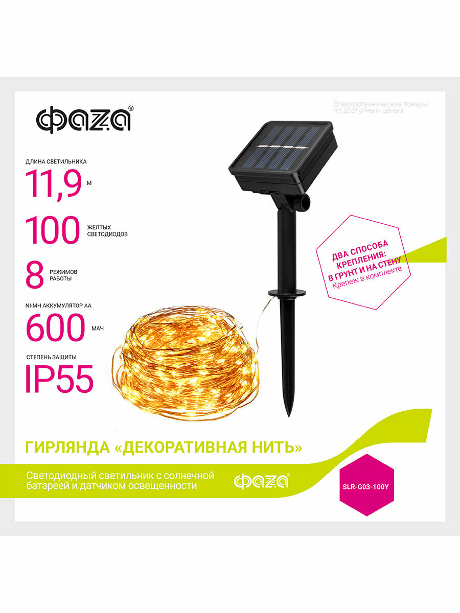 Ниже Вы можете прочитать отзывы на Светильник садовый на солнечной батарее ФАZА SLR-G03-100Y, желтый, 11,9 м, ознакомится с подробными характеристиками, посмотреть интересные обзоры и фотографии на Светильник садовый на солнечной батарее ФАZА SLR-G03-100Y, желтый, 11,9 м.