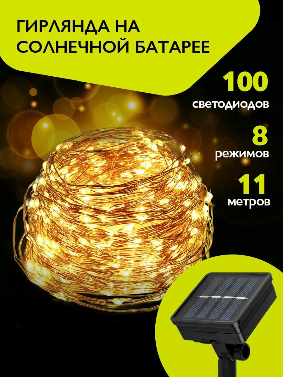 Гирлянда светодиодная 100LED 11,9м SLR-G03-100W нить холодный белый солн. батарея 8 режимов IP55 ФАZА