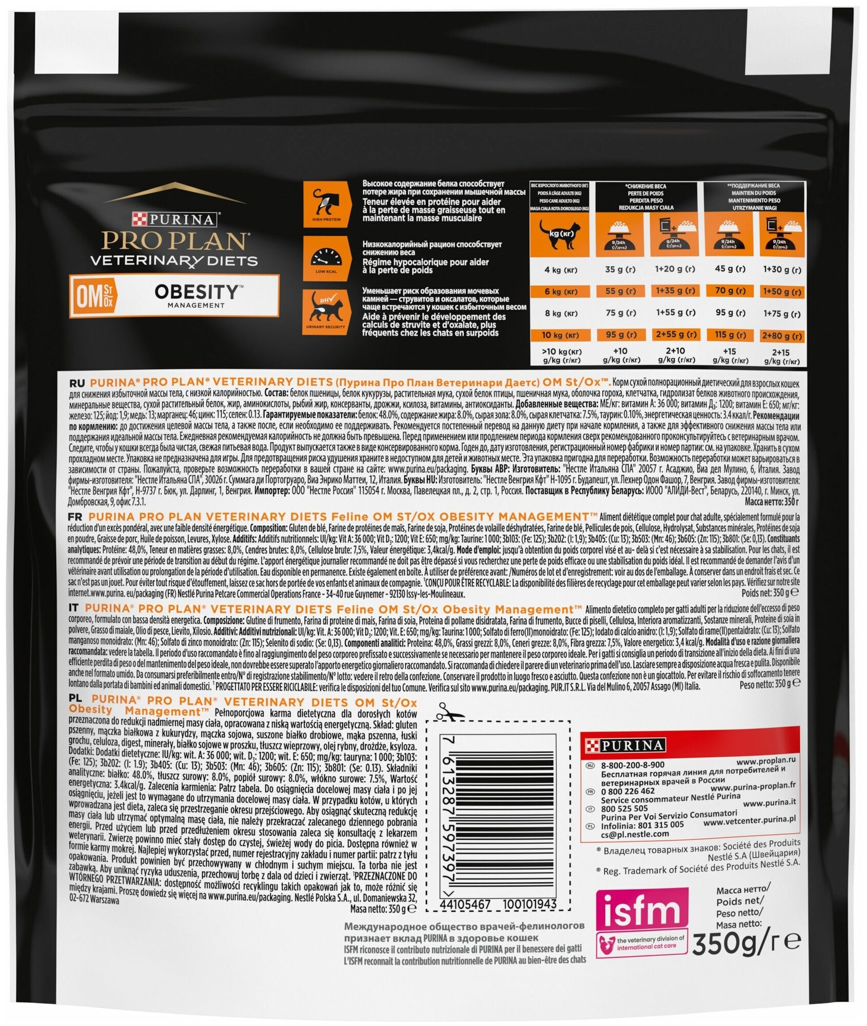 Сухой корм для кошек Purina Pro Plan Veterinary Diets OM St/Ox OBESITY MANAGEMENT, для снижения избыточной массы тела, 2 шт. х 350 г
