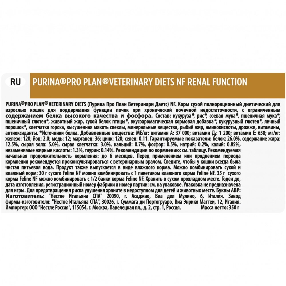 Купить Сухой корм Pro Plan Veterinary Diets NF Renal Function для взрослых кошек при хронической почечной недостаточности, 350 г